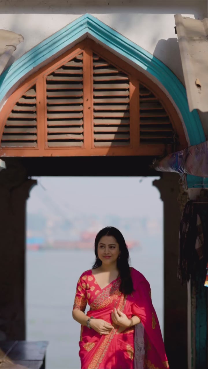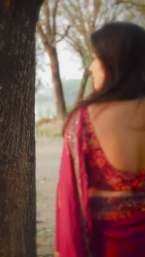 • Elegant rani color with premium Chanderi shine